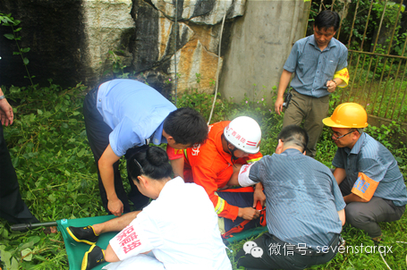 上午9时,2名脱离团队的游客擅自攀爬骆驼山,受伤被困,由于雨后山体湿滑异常加之石壁十分陡峭,游客随时都有坠落的可能,现场情况十分危急,团队导游赶到现场后,在“严禁攀爬”的警示牌上发现景区保卫部求援电话,通过电话求救。接到游客求助电话后,经确认情况,景区领导下达了启动《七星景区突发事件处置救援预案》的命令,警戒救援组、抢险救援组、医疗保障组、疏散善后组、信息整理组等各应急小组接到紧急出动的指令后,立即出动到达事故现场进行救援,采取现场警戒、疏散安抚游客、抢救伤员、拍照摄影等一系列救援处置行动。由于现场地势险峻,救援存在难度,为确保安全,景区请求119消防部门给予援助,采用专业绳索等器具实施进一步救援行动,由于报警及时、措施得力,在景区各应急小组和消防部门的共同努力下,成功安全解救了受伤游客,圆满完成应急救援演练任务,达到了预期的目的。