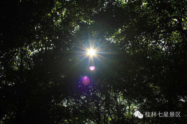 继续往前走,就到七星岩了,虽洞中凉意沁出,让小编十分留恋,但为了完成登山健身、一览山顶美景的目标,于是返回至普陀精舍,沿着右边上山道继续攀登。山道右转,急入山林,开始陡峭起来,深呼吸间感受微风、绿荫,连肺都凉快了下来,阳光透过枝叶缝隙洒下的斑驳,如同星星洒在地上,让此时的风景更添了一种灵动。