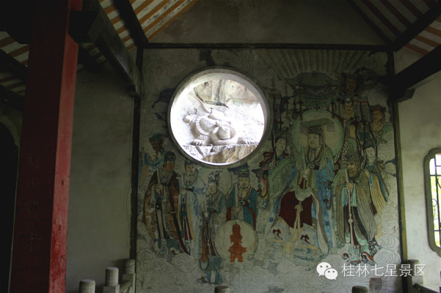 沿精舍左侧穿过石林山道,便是玄武阁,这是进入七星岩的必经之路。听一位路过的带团导游说到:阁中有两奇景,一为彩色壁画,彩色壁画完美诠释了玄武大帝南巡之景,色彩鲜艳的保留至今,堪比敦煌壁画之奇。二为龟蛇合一,是明代道士潘常静留下的珍品,相传此为玄武大帝的化身,象征天地精灵相拥相抱,后来衍化为龟蛇拥抱像。