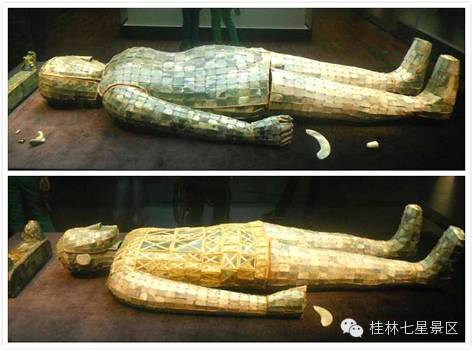 玉衣是汉代皇帝以及王侯贵族的特制葬服,上图是刘胜金缕玉衣(刘胜是汉景帝刘启的庶子,第一代中山国国王,蜀汉昭烈帝刘备的十三世先祖。),长1.88米,用玉片2498片,金丝重约1100克,下图是窦绾(刘胜的妻子)金缕玉衣,长1.72米,用玉片2160片,金丝重约700克。